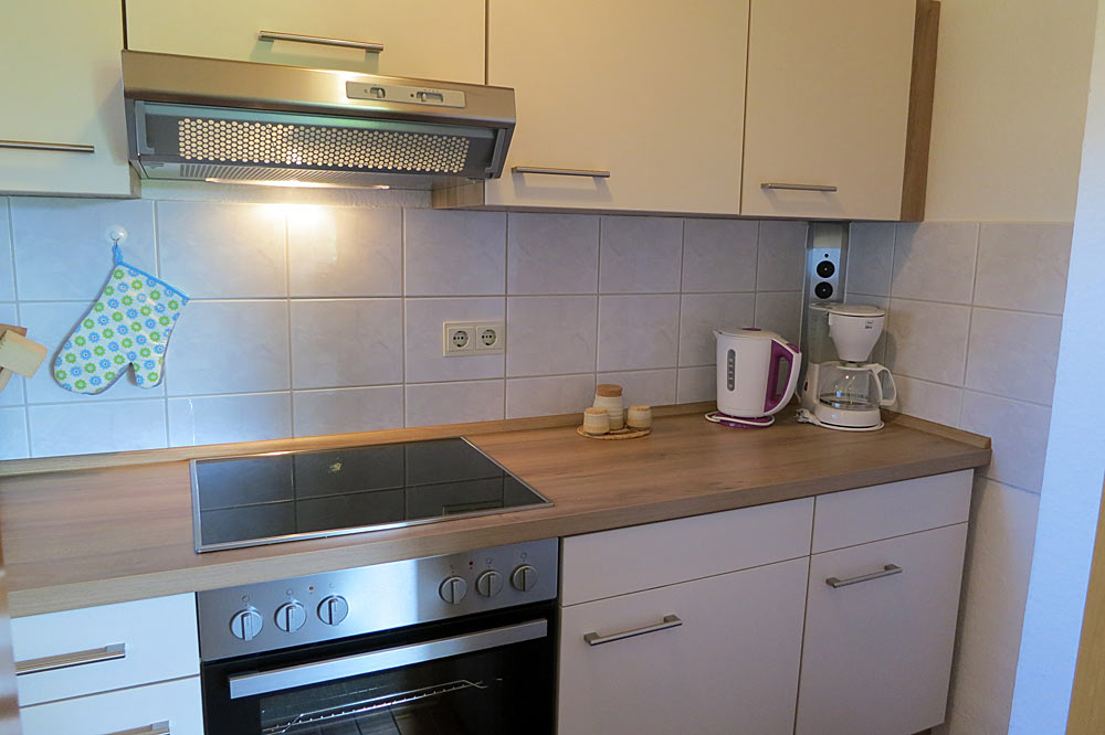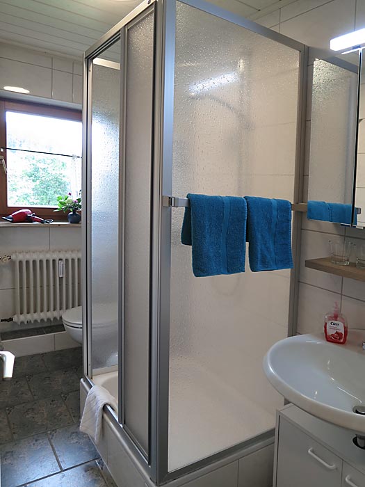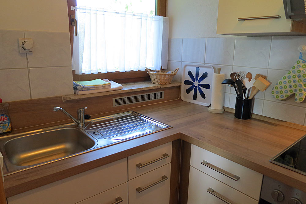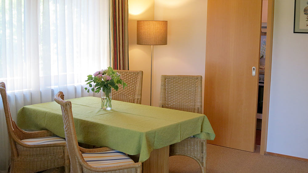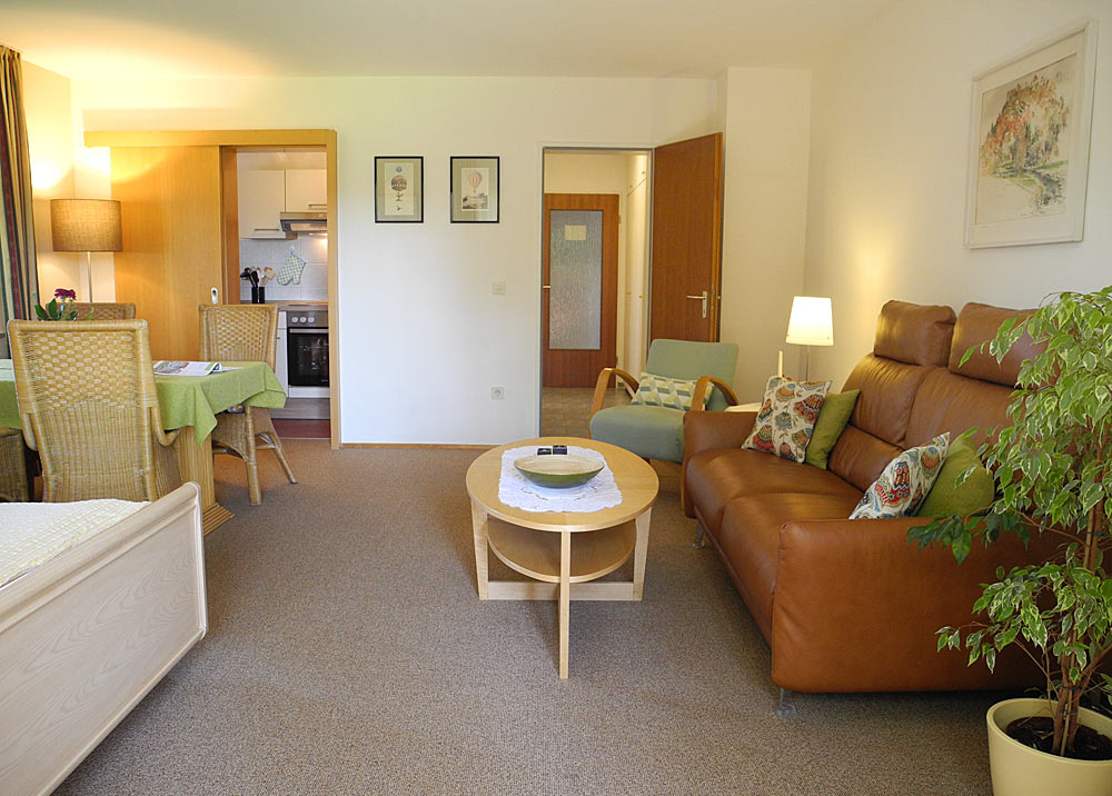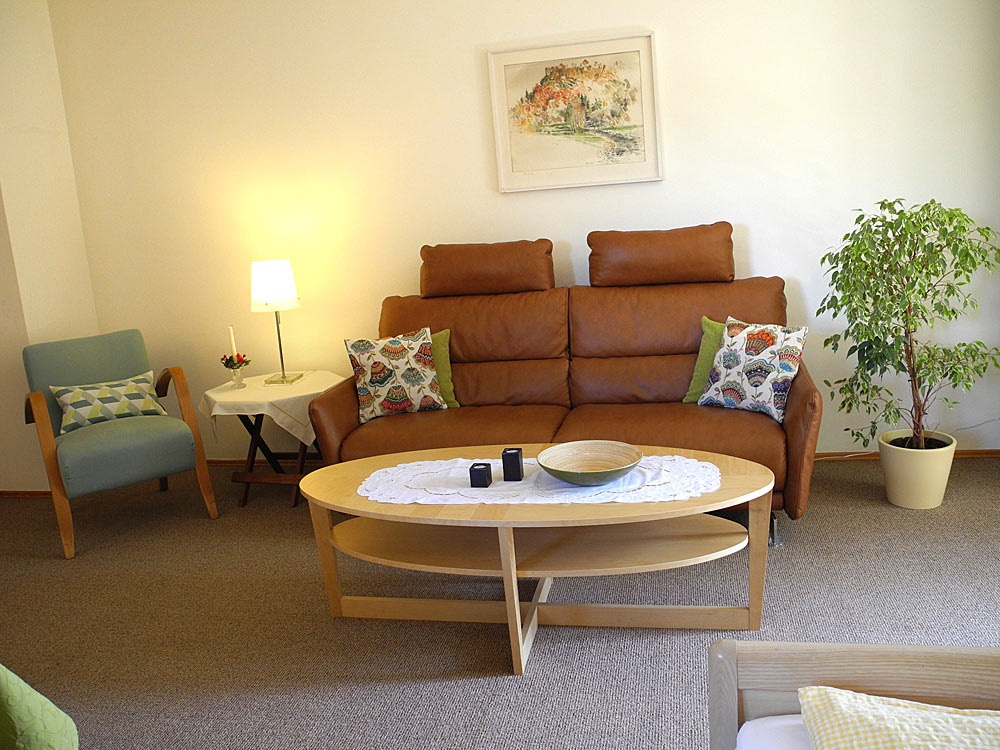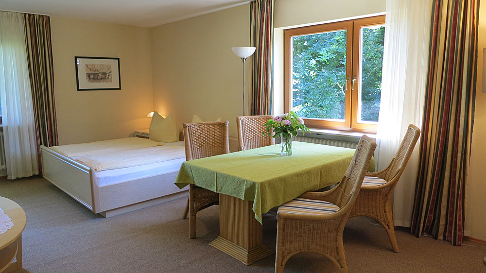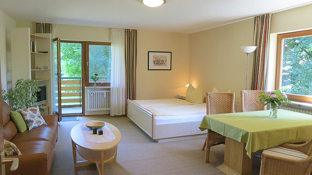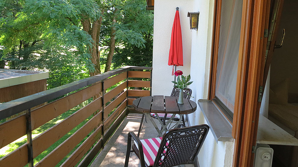 FeWo 4 im 1. Stock ca. 42 m² für 2 Personen (Zusatzbett möglich) Helle freundliche Atmosphäre mit mildem Abendlicht und Blick zum Wald. Kleines Sofabett zum Ausziehen. Mittagssonne auf dem Balkon.